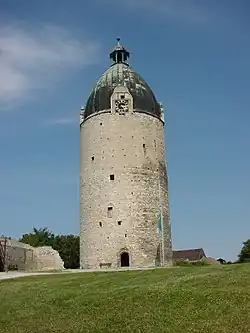 Le côté le plus faible de cette forteresse, à l'est, était couvert par une ancienne muraille de 10 m, doublée d'un fossé profond, creusé à même la craie de la colline. Juste en arrière de ce double dispositif défensif, il y avait, jusqu'à la construction de la chapelle, une ancienne tour ronde en pierre (tour I), de fort diamètre.