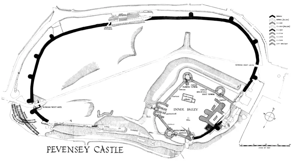- ↑ (en) « Pevensey Castle: a Saxon Shore fort, Norman defences, a medieval enclosure castle, and later associated remains », sur Historic England (consulté le ).
