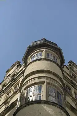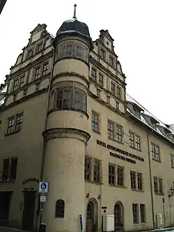 Les façades apparentes sont ornées de pignons à volutes très pentus et une tourelle d'angle. Dans la cour se trouve une autre tour abritant un escalier à vis, à laquelle on accède aujourd'hui via l'orangerie de l'hôtel, ainsi qu'un porche d'entrée somptueusement décoré, avec niches et pilastres. À l'intérieur, la partie conservée et restaurée est en bois, avec poutres apparentes au plafond, boiseries et de riches marqueteries. La première rangée de fenêtre était au moment de la construction celle du premier étage, à 3,50 m de hauteur ; en effet, il y avait à l'époque jusqu'à ce niveau les remparts de la ville. Une autre curiosité du chateau, sont les portes de la salle de la cheminée, aujourd'hui utilisé comme lounge. Elles ont été au moment de la construction directement livrés du Zwinger.