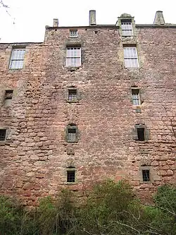 Les restes de l'entrée et de l'aile nord ne regroupent que des portions de murs et l'un des côtés de l'arche d'entrée, avec, en surplomb, les vestiges d'une échauguette. La courtine du XVe siècle s'élève toujours à une hauteur considérable le long de l'aile ouest du château. Cette section du mur a six ouvertures à sa base, l'une d'elles servant de poterne. Sur la façade extérieure, les six renfoncements étaient séparés par des contreforts arrondis. De vieux croquis de Roslin révèlent la présence d'échauguettes au-dessus de chaque contrefort et d'un chemin de ronde les reliant[8].