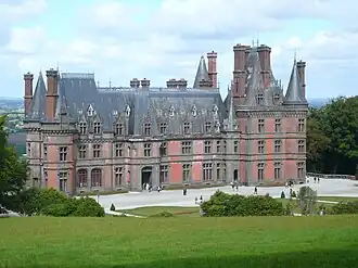 L'architecte a fortement travaillé sur les volumes et les différents styles architecturaux, conférant à la bâtisse cette forte allure néogothique, à la fois château fort et château fantastique de contes de fées. Les faux mâchicoulis, pinacles et autres gravures sur l'extérieur du château, soignées au détail et propres au style néogothique, font référence à la Bretagne, à la chasse, ou aux symboles nobles de tous les temps : feuilles de chêne et glands gravés sur les gouttières, fleur de lys, les parements de brique sont de style Louis XIII... Le château est considéré comme un des sommets de l'« historicisme », courant architectural qui prétend réutiliser les formes du passé[11].
