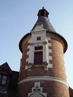 Car la tour en elle-même date du XIXe siècle ; réalisée sur le modèle de la tour de l'aile Louis XII du château de Blois, elle en imite notamment les treillis de briques rouges et noires. Au-dessus d'une coquille François Ier, un petit marmouset commémore sa construction en déployant une banderole sur laquelle est écrit, en latin, « unis par l'amitié, Louis de La Saussaye a voulu, Jules de La Morandière a réalisé ». D'autres sculptures, plus anciennes, ont été incrustées sur la tour, en particulier un porc-épic, emblème de Louis XII, provenant de l'hôtel Hurault de Cheverny, de Blois, et deux personnages de sotties, le pape des fols et la mère folle.