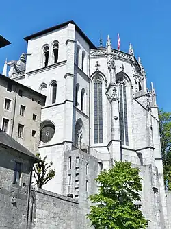 En 1408[4], le comte Amédée VIII de Savoie décide d'ériger une chapelle neuve de style gothique flamboyant, suivant les plans de Nicolas Robert, architecte chambérien. Elle sera achevée durant l'année 1430. Cette chapelle abrita de 1502 à 1578 le Saint-Suaire. En 1466 elle est citée dans une bulle du pape sous le nom de Sainte-Chapelle du Saint Suaire[3]. La même année, sous l'égide de l'architecte Blaise Neyrand, Yolande de France fait édifier le clocher. C'est dans ce clocher ou « tour Yolande » qu'est installé le Grand carillon.
