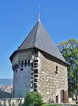 Construite dans la seconde moitié du XIVe siècle, de forme polygonale, en saillie sur la courtine nord, elle se compose d'une chambre basse garnie d'une double canonnière, de la première moitié du XVe siècle[13], aujourd'hui inaccessible car murée en 1726, légèrement voutée qu'éclaire une fenêtre grillagée et au-dessus la « salle haute », voûté avec de belles nervures, qui a contenu les archives des ducs avant que le trésorier général de Savoie en fasse ses bureaux en 1726. Au-dessus, une petite pièce qui s'éclaire, sur ses six pans, par une baie présentant un large ébrasement et la terrasse, ceinte d'un parapet percé de sept archères cruciformes.
