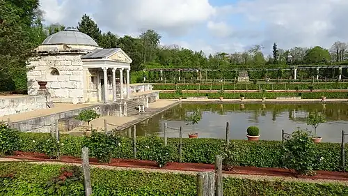 À gauche, une fabrique évoque un temple antique : elle est composée d'éléments provenant du grand escalier du château des Tuileries, détruit par un incendie, en 1871, lors de la Commune de Paris. Les éléments ont été rachetés par Jacques Garcia après la tempête de 1999 et sont classés aux monuments historiques.