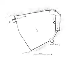 Le plan du château suit l'éperon montagneux à forte pente sur trois côtés (nord, est, sud). Contre le quatrième côté ouvert, qui fait face à l'ouest, il était protégé par un fossé qui est maintenant complètement plat.