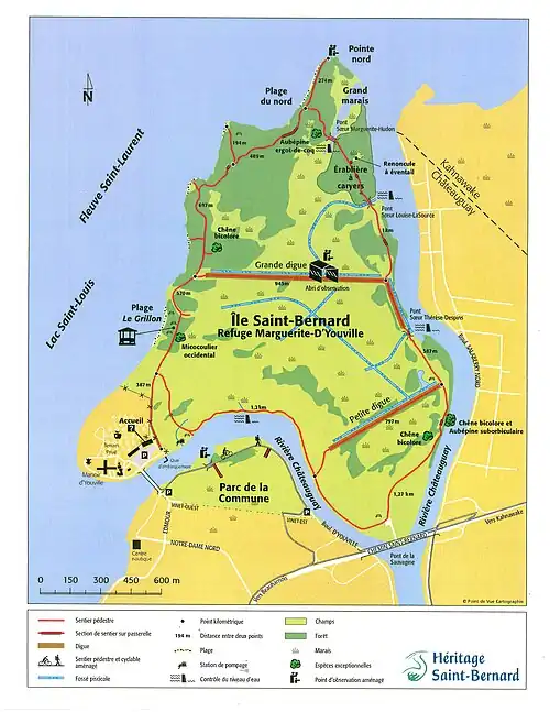 Bordée par le lac Saint-Louis et la rivière Châteauguay, l'île Saint-Bernard est un site riche en nature et en culture. Ancienne seigneurie de Châteauguay, ce territoire a su préserver différents bâtiments historiques dont un des plus anciens moulins en Amérique du Nord, datant de 1686.