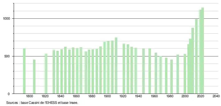 L'évolution du nombre d'habitants est connue à travers les recensements de la population effectués dans la commune depuis 1793. Pour les communes de moins de 10 000 habitants, une enquête de recensement portant sur toute la population est réalisée tous les cinq ans, les populations de référence des années intermédiaires étant quant à elles estimées par interpolation ou extrapolation[22]. Pour la commune, le premier recensement exhaustif entrant dans le cadre du nouveau dispositif a été réalisé en 2004[23].