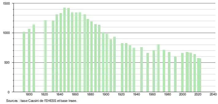 L'évolution du nombre d'habitants est connue à travers les recensements de la population effectués dans la commune depuis 1793. Pour les communes de moins de 10 000 habitants, une enquête de recensement portant sur toute la population est réalisée tous les cinq ans, les populations de référence des années intermédiaires étant quant à elles estimées par interpolation ou extrapolation[28]. Pour la commune, le premier recensement exhaustif entrant dans le cadre du nouveau dispositif a été réalisé en 2005[29].