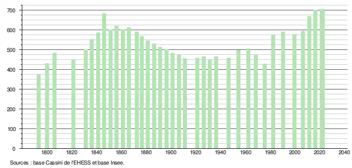 L'évolution du nombre d'habitants est connue à travers les recensements de la population effectués dans la commune depuis 1793. Pour les communes de moins de 10 000 habitants, une enquête de recensement portant sur toute la population est réalisée tous les cinq ans, les populations de référence des années intermédiaires étant quant à elles estimées par interpolation ou extrapolation[18]. Pour la commune, le premier recensement exhaustif entrant dans le cadre du nouveau dispositif a été réalisé en 2006[19].