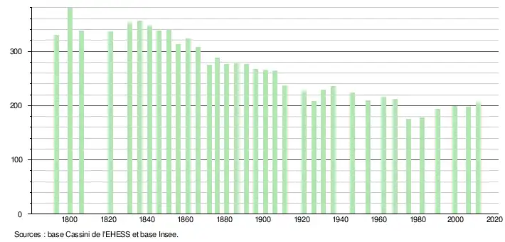- ↑ Dans le tableau des recensements et le graphique, par convention dans Wikipédia, le principe a été retenu, pour les populations légales postérieures à 1999 de n’afficher dans le tableau des recensements et le graphique que les populations correspondant à l'année 2006, première population légale publiée calculée conformément aux concepts définis dans le décret no 2003-485 du 5 juin 2003, et les années correspondant à une enquête exhaustive de recensement pour les communes de moins de 10 000 habitants, ainsi que la dernière population légale publiée par l’Insee.