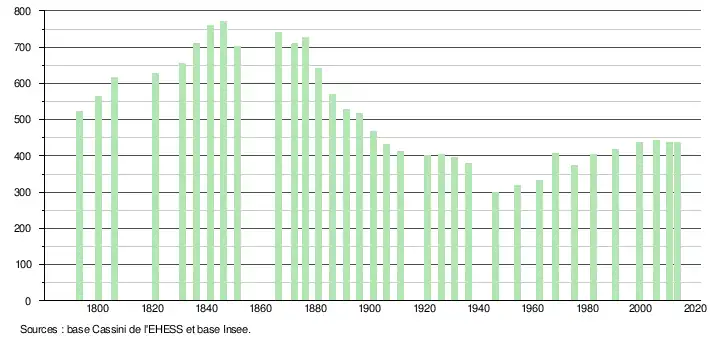 L'évolution du nombre d'habitants est connue à travers les recensements de la population effectués dans la commune depuis 1793. À partir du , les populations légales des communes sont publiées annuellement dans le cadre d'un recensement qui repose désormais sur une collecte d'information annuelle, concernant successivement tous les territoires communaux au cours d'une période de cinq ans. Pour les communes de moins de 10 000 habitants, une enquête de recensement portant sur toute la population est réalisée tous les cinq ans, les populations légales des années intermédiaires étant quant à elles estimées par interpolation ou extrapolation[8]. Pour la commune, le premier recensement exhaustif entrant dans le cadre du nouveau dispositif a été réalisé en 2005[9],[Note 1].
