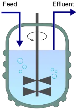 Un chémostat (contraction de "environnement chimique qui reste statique") est un bioréacteur dans lequel du milieu frais est ajouté en continu, tandis que le liquide de culture contenant les nutriments restants, les produits finaux métaboliques et les micro-organismes est éliminé en continu à la même vitesse pour maintenir le volume de culture constant[2],[3]. En modifiant la vitesse à laquelle le milieu est ajouté au bioréacteur, la vitesse de croissance spécifique du micro-organisme peut être facilement contrôlée dans certaines limites.