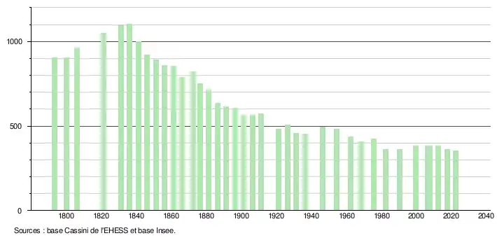 L'évolution du nombre d'habitants est connue à travers les recensements de la population effectués dans la commune depuis 1793. Pour les communes de moins de 10 000 habitants, une enquête de recensement portant sur toute la population est réalisée tous les cinq ans, les populations de référence des années intermédiaires étant quant à elles estimées par interpolation ou extrapolation[18]. Pour la commune, le premier recensement exhaustif entrant dans le cadre du nouveau dispositif a été réalisé en 2007[19].