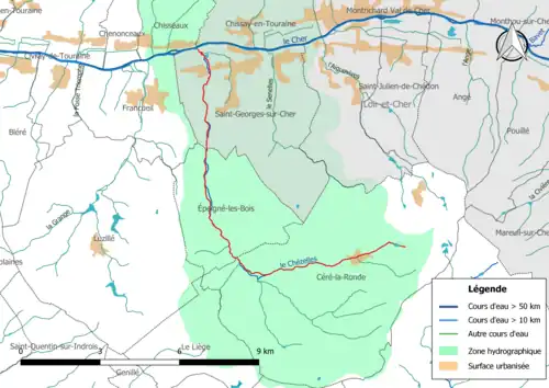 Le Chézelles traverse 3 communes, soit de l'amont vers l'aval : Céré-la-Ronde (Indre-et-Loire), Épeigné-les-Bois (Indre-et-Loire), Saint-Georges-sur-Cher (Loir-et-Cher).