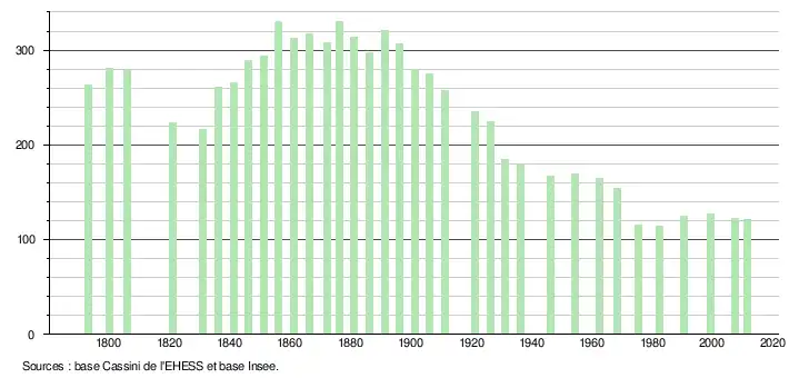 - ↑ Par convention dans Wikipédia, le principe a été retenu de n’afficher dans le tableau des recensements et le graphique, pour les populations légales postérieures à 1999, que les populations correspondant à une enquête exhaustive de recensement pour les communes de moins de 10 000 habitants, et que les populations des années 2006, 2011, 2016, etc. pour les communes de plus de 10 000 habitants, ainsi que la dernière population légale publiée par l’Insee pour l'ensemble des communes.