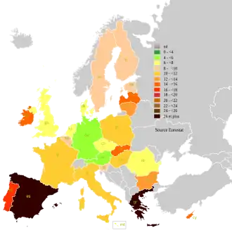 En , le taux de chômage des jeunes (moins de 25 ans) s’est établi à 21,4 % dans l’Union européenne et à 23,0 % dans la zone euro, contre respectivement 23,1 % et 23,9 % en . Il s’agit du taux le plus bas enregistré pour l’Union européenne depuis et pour la zone euro depuis . Les taux les plus bas en ont été observés en Allemagne (7,2 %), en Autriche (9,0 %) ainsi qu’aux Pays-Bas (9,6 %), et les plus élevés en Espagne (51,4 %), en Grèce (50,6 % en ), en Croatie (44,8 % au quatrième trimestre 2014) et en Italie (42,0%). La France se trouve légèrement au-dessus de la moyenne avec 25,2 %[2].
