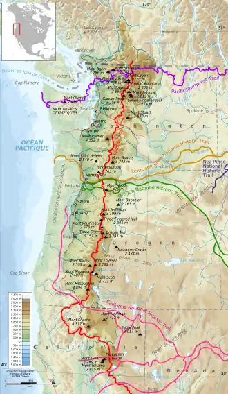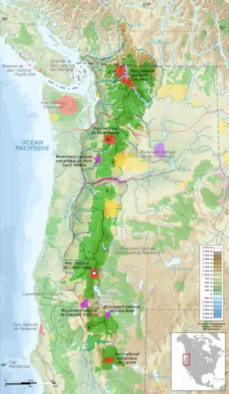 La chaîne des Cascades est un massif montagneux qui s'étend le long de la côte Ouest de l'Amérique du Nord, à une distance moyenne de 200 kilomètres de l'océan Pacifique, du Sud de la province de Colombie-Britannique au Canada jusqu'au Nord de la Californie aux États-Unis en passant par les États de Washington et de l'Oregon. Elle est limitée au nord par la rivière Thompson avant sa confluence avec le fleuve Fraser et au sud par le lac Almanor. Elle fait partie des chaînes côtières du Pacifique et se prolonge au nord par la chaîne Côtière et au sud par la Sierra Nevada[10]. Au-delà du plateau du Columbia, à l'est, selon un même axe nord/sud s'élèvent les montagnes Rocheuses. Sa seule bordure maritime se situe au niveau du Puget Sound au nord-ouest de l'État de Washington[11].