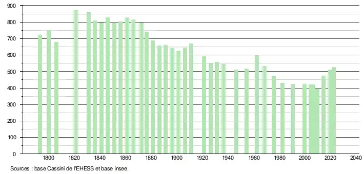 L'évolution du nombre d'habitants est connue à travers les recensements de la population effectués dans la commune depuis 1793. Pour les communes de moins de 10 000 habitants, une enquête de recensement portant sur toute la population est réalisée tous les cinq ans, les populations de référence des années intermédiaires étant quant à elles estimées par interpolation ou extrapolation[15]. Pour la commune, le premier recensement exhaustif entrant dans le cadre du nouveau dispositif a été réalisé en 2004[16].