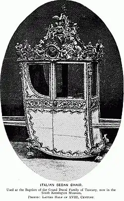 Trevor Fawcett note que les voyageurs anglais Fynes Moryson (en 1594) et John Evelyn (en 1644 - 1645) remarquèrent que les seggioli de Naples et de Gênes, qui étaient des chaises à porteurs que l'on pouvait louer, étaient suspendues à des perches et portées sur les épaules des porteurs, à la différence de ce qui se faisait en Angleterre et en France.