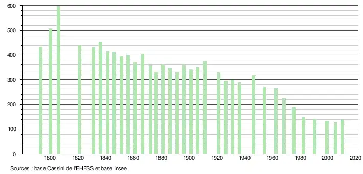 - ↑ Par convention dans Wikipédia, le principe a été retenu de n’afficher dans le tableau des recensements et le graphique, pour les populations légales postérieures à 1999, que les populations correspondant à une enquête exhaustive de recensement pour les communes de moins de 10 000 habitants, et que les populations des années 2006, 2011, 2016, etc. pour les communes de plus de 10 000 habitants, ainsi que la dernière population légale publiée par l’Insee pour l'ensemble des communes.