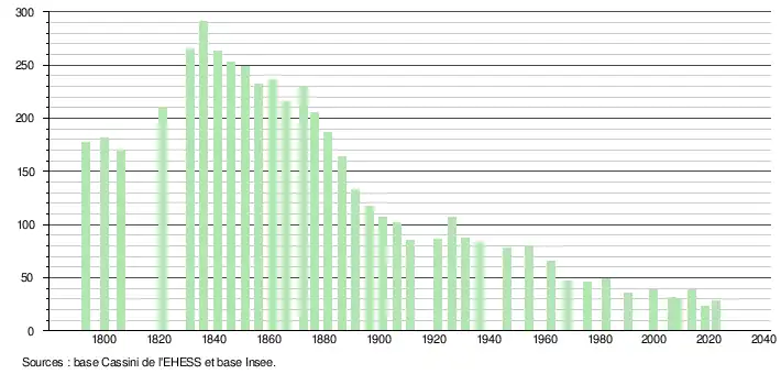 L'évolution du nombre d'habitants est connue à travers les recensements de la population effectués dans la commune depuis 1793. Pour les communes de moins de 10 000 habitants, une enquête de recensement portant sur toute la population est réalisée tous les cinq ans, les populations de référence des années intermédiaires étant quant à elles estimées par interpolation ou extrapolation[14]. Pour la commune, le premier recensement exhaustif entrant dans le cadre du nouveau dispositif a été réalisé en 2008[15].