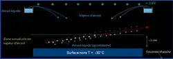 Toutefois, une petite fraction des vapeurs d’alcool refroidies par l’intermédiaire de la surface froide ne se condensent pas et flottent au-dessus de la surface formant un volume sursaturé en vapeur qui est métastable (car constitué d’un gaz refroidi). Il suffira d’une perturbation dans la matière pour que ces vapeurs retournent à un état plus stable (l’état liquide). L’épaisseur du volume de gaz sensible est de quelques millimètres, située juste au-dessus de la surface de la chambre.