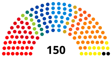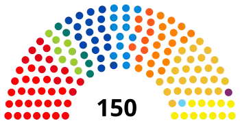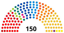 L'hémicycle se compose de 150 députés répartis en deux groupes linguistiques, un groupe linguistique francophone (62 sièges) et un groupe linguistique néerlandophone (88 sièges). Il n'y a pas de groupe linguistique germanophone et les représentants élus des circonscriptions électorales de langue allemande au sein de la Chambre sont rattachés au groupe francophone.