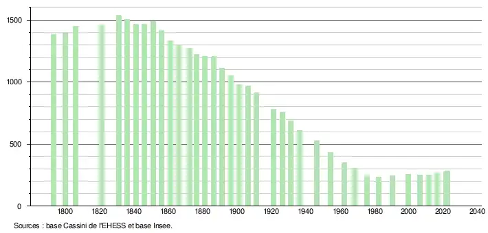 L'évolution du nombre d'habitants est connue à travers les recensements de la population effectués dans la commune depuis 1793. Pour les communes de moins de 10 000 habitants, une enquête de recensement portant sur toute la population est réalisée tous les cinq ans, les populations de référence des années intermédiaires étant quant à elles estimées par interpolation ou extrapolation[17]. Pour la commune, le premier recensement exhaustif entrant dans le cadre du nouveau dispositif a été réalisé en 2006[18].