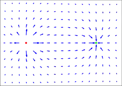 - , où est le vecteur unitaire de la droite reliant q1 et q2, dirigée selon le sens 1 → 2, étant la permittivité diélectrique du vide.