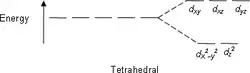 La théorie des groupes montre que les cinq orbitales d se répartissent en deux niveaux notés e, pour les orbitales dx2−y2 et dz2 et t2 pour les trois autres dxy, dxz et dyz. Les étiquettes e et t2 en symétrie tétraédrique diffèrent des étiquettes eg et t2g de la symétrie octaédrique par l'indice g (pour gerade, signifiant « pair » en allemand) indiquant la parité par rapport au centre de symétrie, centre absent en symétrie tétraédrique. Le niveau d'énergie e est inférieur au niveau t2 puisque les ligands ne pointent pas suivant les axes comme c'est le cas en symétrie octaédrique. Le diagramme d'énergie en symétrie tétraédrique est donc l'inverse de celui en symétrie octaédrique (voir tableau ci-dessous).