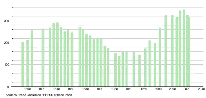 L'évolution du nombre d'habitants est connue à travers les recensements de la population effectués dans la commune depuis 1793. Pour les communes de moins de 10 000 habitants, une enquête de recensement portant sur toute la population est réalisée tous les cinq ans, les populations de référence des années intermédiaires étant quant à elles estimées par interpolation ou extrapolation[20]. Pour la commune, le premier recensement exhaustif entrant dans le cadre du nouveau dispositif a été réalisé en 2005[21].