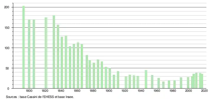 L'évolution du nombre d'habitants est connue à travers les recensements de la population effectués dans la commune depuis 1793. Pour les communes de moins de 10 000 habitants, une enquête de recensement portant sur toute la population est réalisée tous les cinq ans, les populations de référence des années intermédiaires étant quant à elles estimées par interpolation ou extrapolation[31]. Pour la commune, le premier recensement exhaustif entrant dans le cadre du nouveau dispositif a été réalisé en 2004[32].