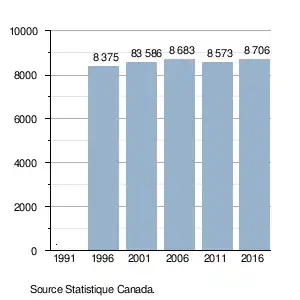 Au recensement du Canada de 2016, la population totale s'élève à 8 706 habitants, soit une hausse de 133 personnes (