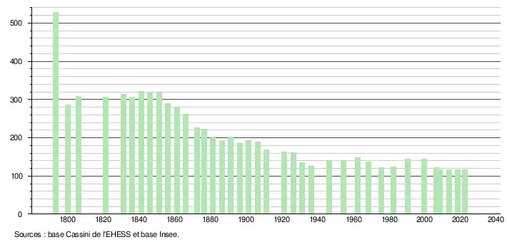 L'évolution du nombre d'habitants est connue à travers les recensements de la population effectués dans la commune depuis 1793. Pour les communes de moins de 10 000 habitants, une enquête de recensement portant sur toute la population est réalisée tous les cinq ans, les populations de référence des années intermédiaires étant quant à elles estimées par interpolation ou extrapolation[21]. Pour la commune, le premier recensement exhaustif entrant dans le cadre du nouveau dispositif a été réalisé en 2008[22].