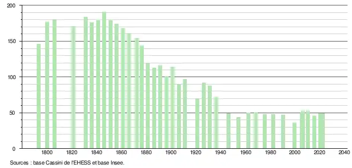 L'évolution du nombre d'habitants est connue à travers les recensements de la population effectués dans la commune depuis 1793. Pour les communes de moins de 10 000 habitants, une enquête de recensement portant sur toute la population est réalisée tous les cinq ans, les populations de référence des années intermédiaires étant quant à elles estimées par interpolation ou extrapolation[26]. Pour la commune, le premier recensement exhaustif entrant dans le cadre du nouveau dispositif a été réalisé en 2005[27].