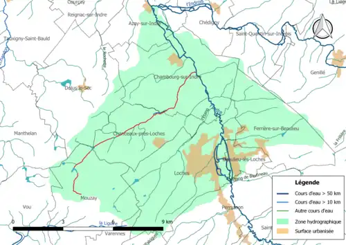 Les bassins hydrographiques sont découpés dans le référentiel national BD Carthage en éléments de plus en plus fins, emboîtés selon quatre niveaux : régions hydrographiques, secteurs, sous-secteurs et zones hydrographiques[4]. Le bassin versant du Chanteraine s'insère dans la zone hydrographique « L'Indre du ruisseau de Boutineau (Nc) à l'Indrois (Nc) », au sein du bassin DCE plus large « La Loire, les cours d'eau côtiers vendéens et bretons ».