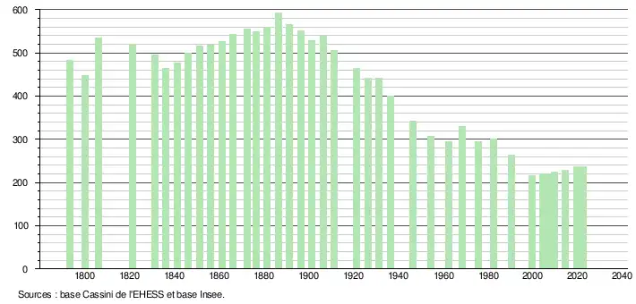 L'évolution du nombre d'habitants est connue à travers les recensements de la population effectués dans la commune depuis 1793. Pour les communes de moins de 10 000 habitants, une enquête de recensement portant sur toute la population est réalisée tous les cinq ans, les populations de référence des années intermédiaires étant quant à elles estimées par interpolation ou extrapolation[15]. Pour la commune, le premier recensement exhaustif entrant dans le cadre du nouveau dispositif a été réalisé en 2004[16].