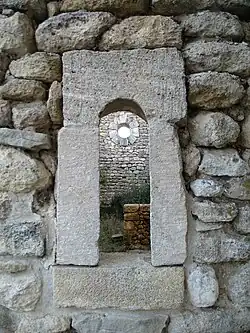 L'intérieur, à ciel ouvert, conserve un bel arc triomphal en pierre de taille[1] aux impostes saillantes et une belle abside voûtée en cul-de-four.
