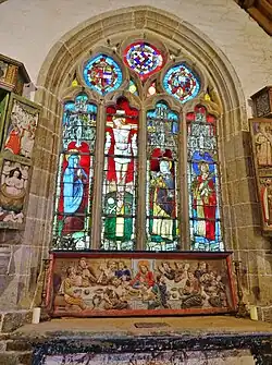 De cette verrière, avant cette date qui annonce sa restauration, il ne restait plus en place que quarante-cinq pour cent de vitraux anciens. Les parties manquantes étaient en verre dépoli et quelques morceaux de couleur bleue en verre plat qui avaient été utilisés ici et là dont la robe de la Vierge. Ces éléments peuvent nous donner une approche d’une petite restauration postérieure à la seconde partie du XIXe siècle. Cette façon de procéder, qui est plus proche de la conservation que de la restauration, est typique d’un atelier quimpérois comme celui de Cassaigne qui habitait place au Beurre, ne possédant pas de four, ni de grisaille et peut-être pas la main assez habile pour reprendre des pièces dans l’esprit des anciennes. Il restaurait ainsi, sauvant de la ruine certaine, de nombreux vitraux de la région quimpéroise. Cette verrière a été restaurée en 1981 par le maître-verrier Jean-Pierre Le Bihan et la chapelle dans son ensemble a été restaurée entre 1979 et 1987.