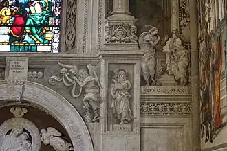 En partant de l'arcosolium, deux anges peints tiennent un crâne dans leurs mains et un autre sous un pied, et font face à une table sculptée devant un faux compartiment avec d'autres crânes, où figure l'inscription NI HANC DESPEXERIS VIVES (« si tu ne méprises pas ceci - le crâne - tu vivras »). À côté des anges se dressent deux hautes colonnes richement décorées, sur les semelles desquelles se trouvent les personnifications de la Charité (à gauche), allaitant trois enfants et avec le feu, son emblème, et de la Foi (à droite), avec un crucifix, un ciboire et une hostie près d'elle.