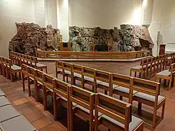 Les murs intérieurs de la chapelle sont blancs et maçonnés de manière que les jointures forment des lignes verticales et horizontales uniformes. Une grande partie de la partie inférieure du mur de l'autel est constituée de roche nue.
