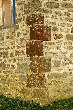 La façade occidentale, remaniée au XIXe siècle[4], est percée d'une petite porte rectangulaire et de deux petites baies carrées. Chacune de ces trois ouvertures est surmontée d'un arc de décharge en briques qui contraste avec la maçonnerie de moellons. Elle est cantonnée de chaînages d'angle réalisés au moyen de gros blocs de grès ferrugineux.