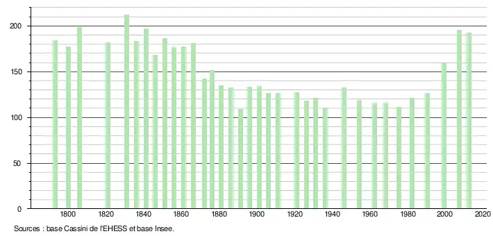 - ↑ Par convention dans Wikipédia, le principe a été retenu de n’afficher dans le tableau des recensements et le graphique, pour les populations légales postérieures à 1999, que les populations correspondant à une enquête exhaustive de recensement pour les communes de moins de 10 000 habitants, et que les populations des années 2006, 2011, 2016, etc. pour les communes de plus de 10 000 habitants, ainsi que la dernière population légale publiée par l’Insee pour l'ensemble des communes.