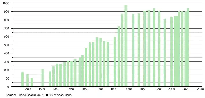 L'évolution du nombre d'habitants est connue à travers les recensements de la population effectués dans la commune depuis 1793. Pour les communes de moins de 10 000 habitants, une enquête de recensement portant sur toute la population est réalisée tous les cinq ans, les populations de référence des années intermédiaires étant quant à elles estimées par interpolation ou extrapolation[20]. Pour la commune, le premier recensement exhaustif entrant dans le cadre du nouveau dispositif a été réalisé en 2004[21].