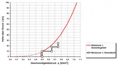 La vitesses de vent (de) à la surface de la Terre est pratiquement nulle et augmente avec l'éloignement de la surface de la Terre, c'est-à-dire avec la hauteur du bâtiment (de). Pour les cas simples, la pression dynamique pour des hauteurs de bâtiment allant jusqu'à 25 mètres est compilée dans le tableau 2 de la norme DIN 1055-4.
