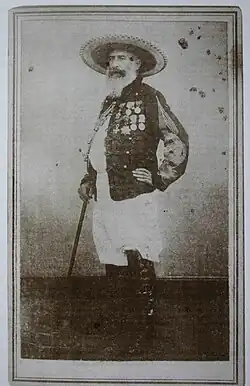 Je le revois encore, dans l'uniforme éclatant et bizarre qu'il avait adopté : un dolman rouge, ouvert, flottant sur la chemise de flanelle et orné des cinq galons d'or de colonel, dont le nœud hongrois recouvrait les deux manches ; une large culotte blanche qui se perdait dans des bottes montant jusqu'au genou, et le sombrero mexicain de feutre gris clair, aux vastes bords plats, historiés comme une mitre d'évêque, garnis de pampilles, dont la coiffe était entourée d'un énorme bourdalou d'or. » in Mes souvenirs [lire en ligne] - ↑ Son manuscrit intitulé Historique de la contre-guérilla des terres chaudes du Mexique (1865) est conservé au Service historique de la Défense.