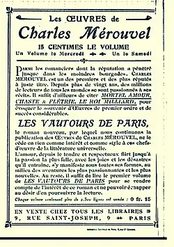 Il inaugura la célèbre collection à 65 centimes, « Le Livre populaire »[1], éditée par Fayard[2]. Si les livres de Charles Mérouvel semblent démodés, il fut avec Xavier de Montepin, Jules Mary, Emile Richebourg, Pierre Decourcelle et Georges Ohnet, un des maîtres du roman populaire mondain, qui irrite souvent par sa complaisance dans la description de la vie des classes aisées, à la fin du XIXe siècle, avec hôtels particuliers, châteaux en province, nobles châtelaines, traîtres à monocles, et où le peuple n’apparaît guère que sous la livrée de domestiques tantôt dévoués corps et âme à leurs maîtres, tantôt envieux, sournois et méchants[α 1]. L’auteur cherche à dépeindre les dernières années d’un monde condamné, vivant sur lui-même de ses souvenirs et de sa grandeur passée, sans prise sur l’avenir.