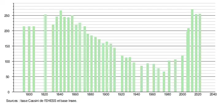 L'évolution du nombre d'habitants est connue à travers les recensements de la population effectués dans la commune depuis 1793. Pour les communes de moins de 10 000 habitants, une enquête de recensement portant sur toute la population est réalisée tous les cinq ans, les populations de référence des années intermédiaires étant quant à elles estimées par interpolation ou extrapolation[20]. Pour la commune, le premier recensement exhaustif entrant dans le cadre du nouveau dispositif a été réalisé en 2007[21].