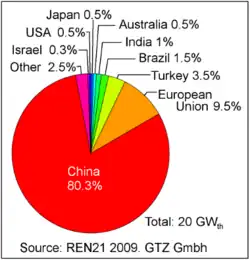 Les systèmes de chauffage solaire de l'eau sont populaires en Chine, où les modèles de base commencent à environ 1 500 yuans (235 dollars américains), soit environ 80 % moins chers que dans les pays occidentaux pour une taille de collecteur donnée. Au moins 30 millions de foyers chinois en possèdent un. La popularité s'explique par l'utilisation de tubes sous vide efficaces qui permettent aux chauffe-eau de fonctionner même par temps nuageux et à des températures bien inférieures à zéro[16].